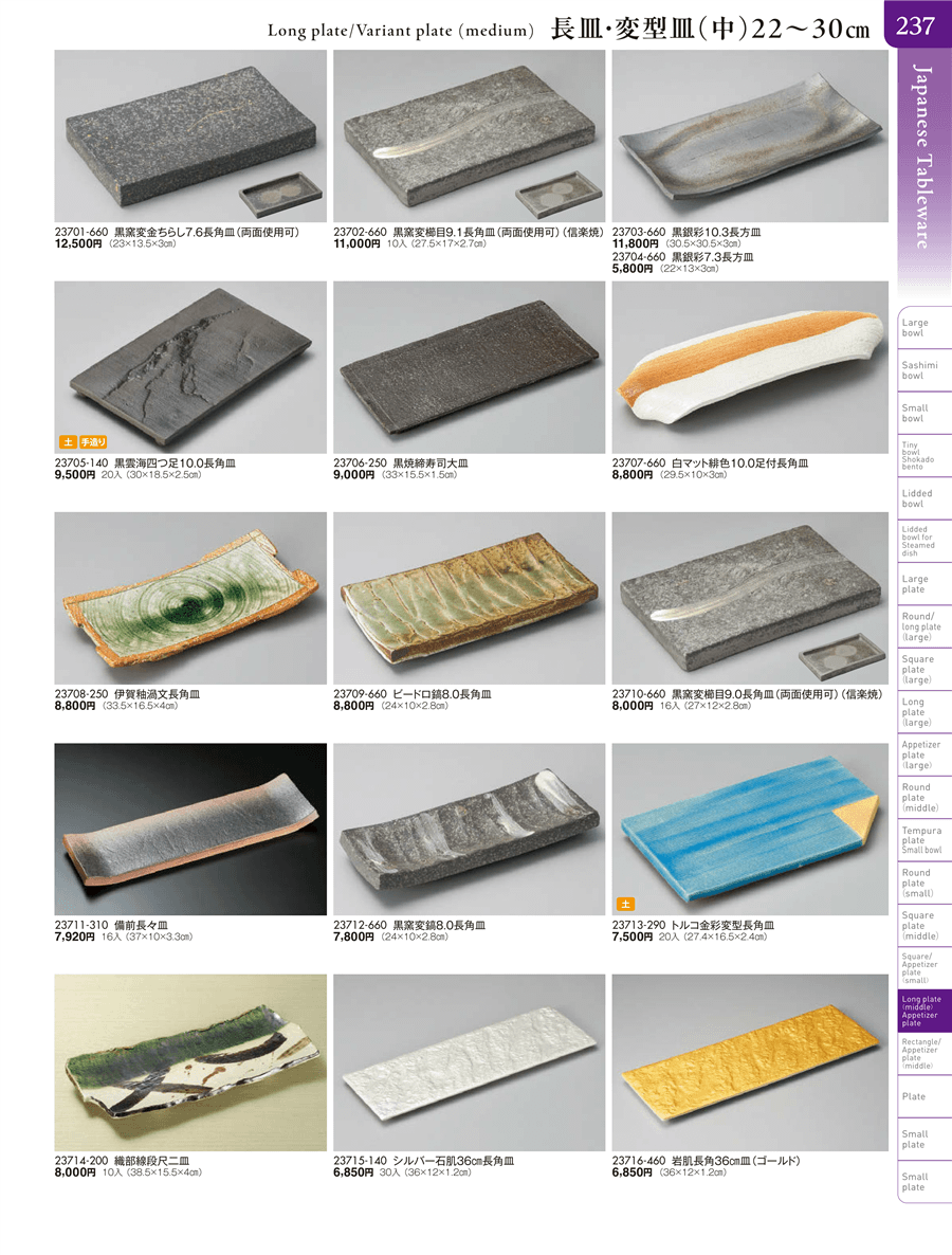 | 23704-660 | 黒銀彩7.3長方皿 | 上代 5,800円(税抜) 卸値 3,191円(税抜) (45%OFF) | ||