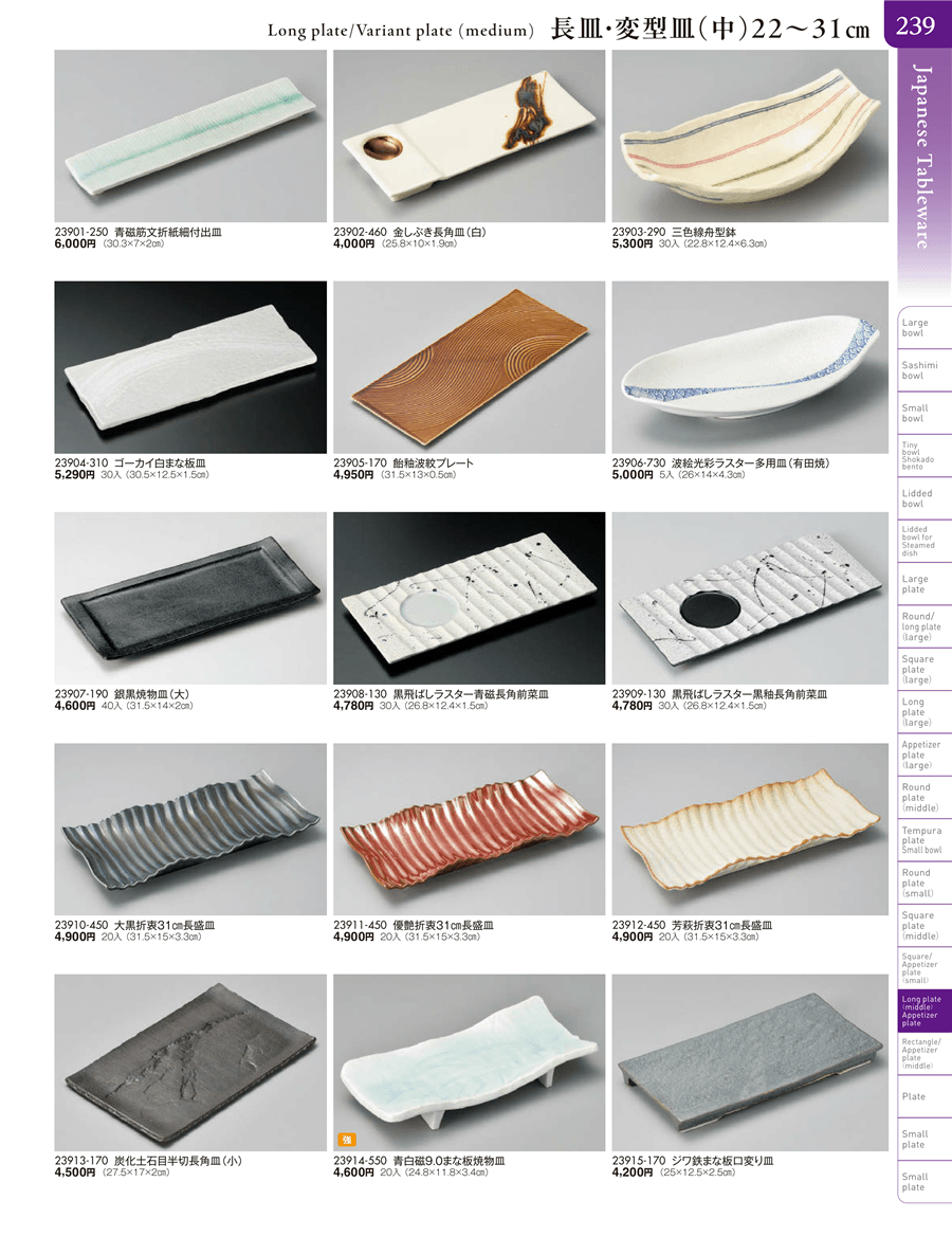 | 23913-170 | 炭化土石目半切長角皿(小) | 上代 4,500円(税抜) 卸値 2,475円(税抜) (45%OFF) | ||