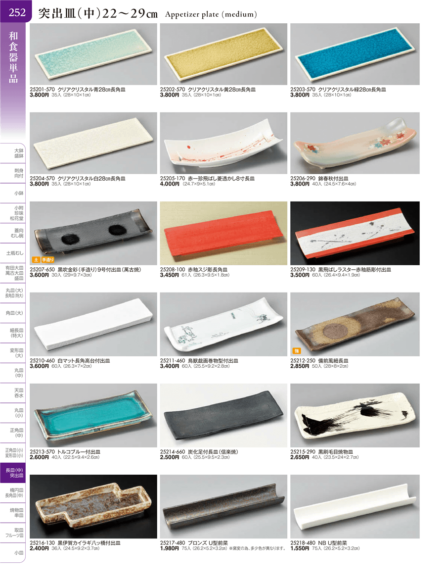 | 25208-100 | 赤釉スジ彫長角皿 | 上代 3,450円(税抜) 卸値 1,898円(税抜) (45%OFF) | ||