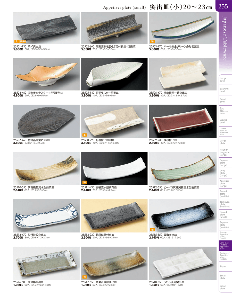| 25518-550 | うのふ長角突出皿 | 上代 1,850円(税抜) 卸値 1,018円(税抜) (45%OFF) | ||