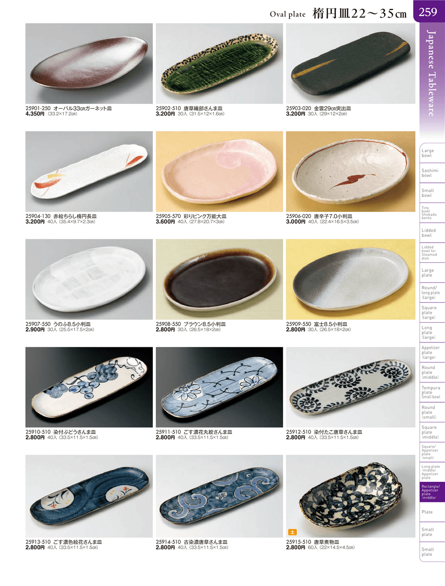 | 25904-130 | 赤絵ちらし楕円長皿 | 上代 3,200円(税抜) 卸値 1,761円(税抜) (45%OFF) | ||