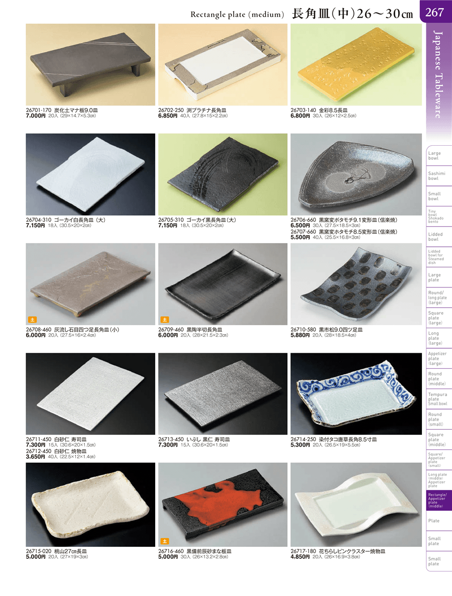 | 26709-460 | 黒陶半切長角皿 | 上代 6,000円(税抜) 卸値 3,301円(税抜) (45%OFF) | ||