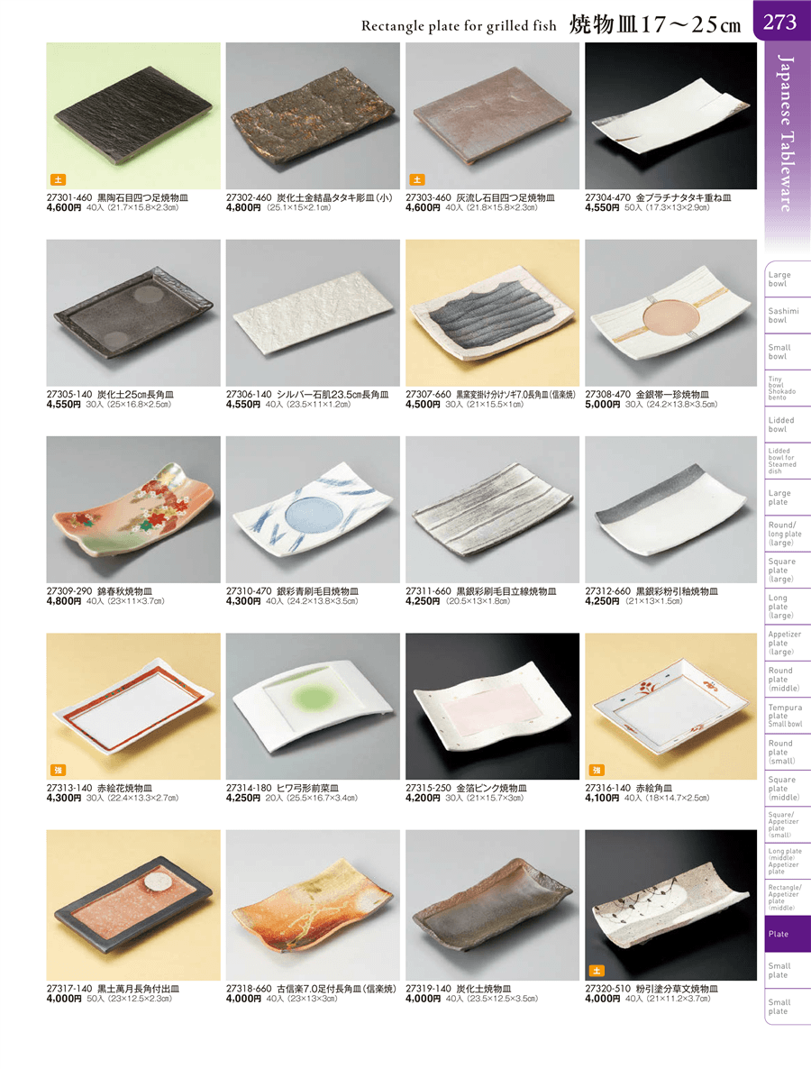 | 27307-660 | 黒窯変掛け分けソギ7.0長角皿(信楽焼) | 上代 4,500円(税抜) 卸値 2,475円(税抜) (45%OFF) | ||
