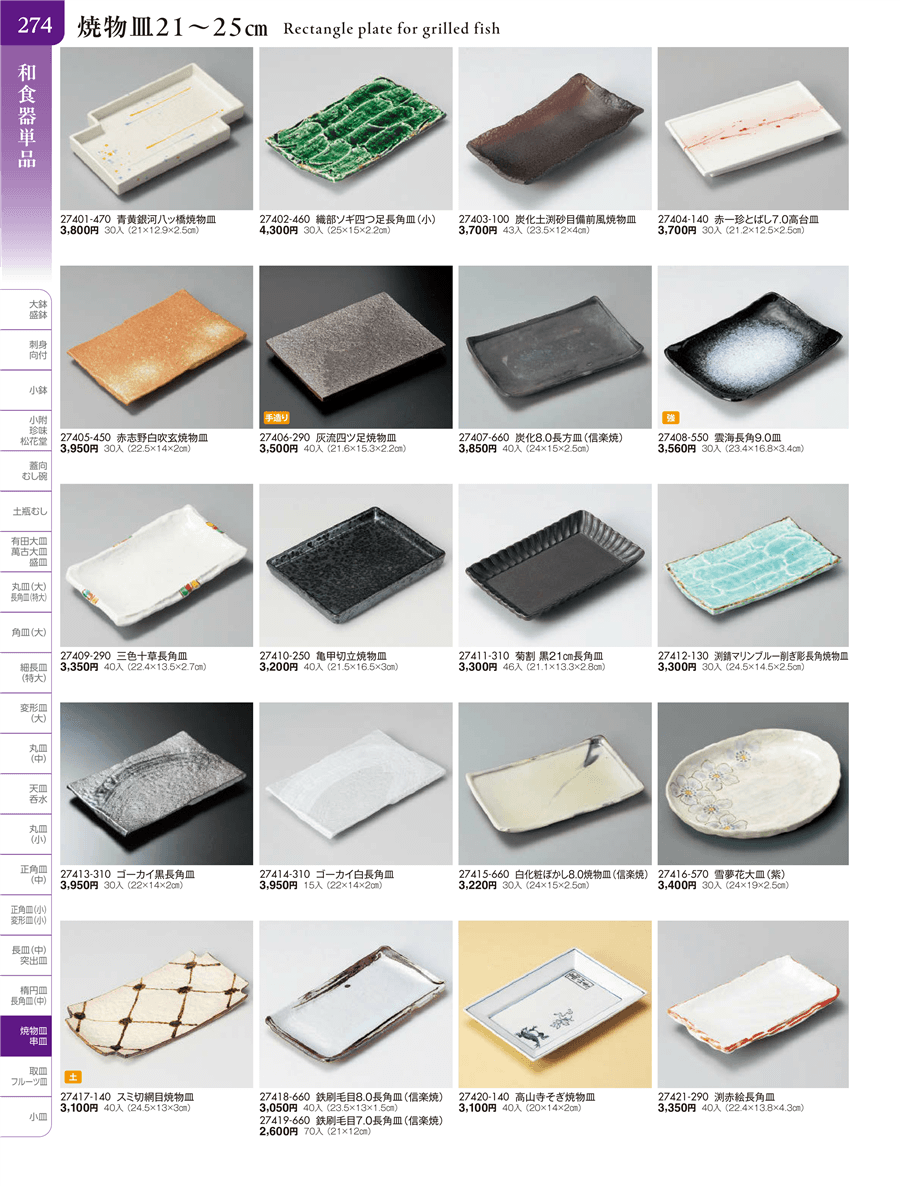 | 27402-460 | 織部ソギ四つ足長角皿(小) | 上代 4,300円(税抜) 卸値 2,365円(税抜) (45%OFF) | ||