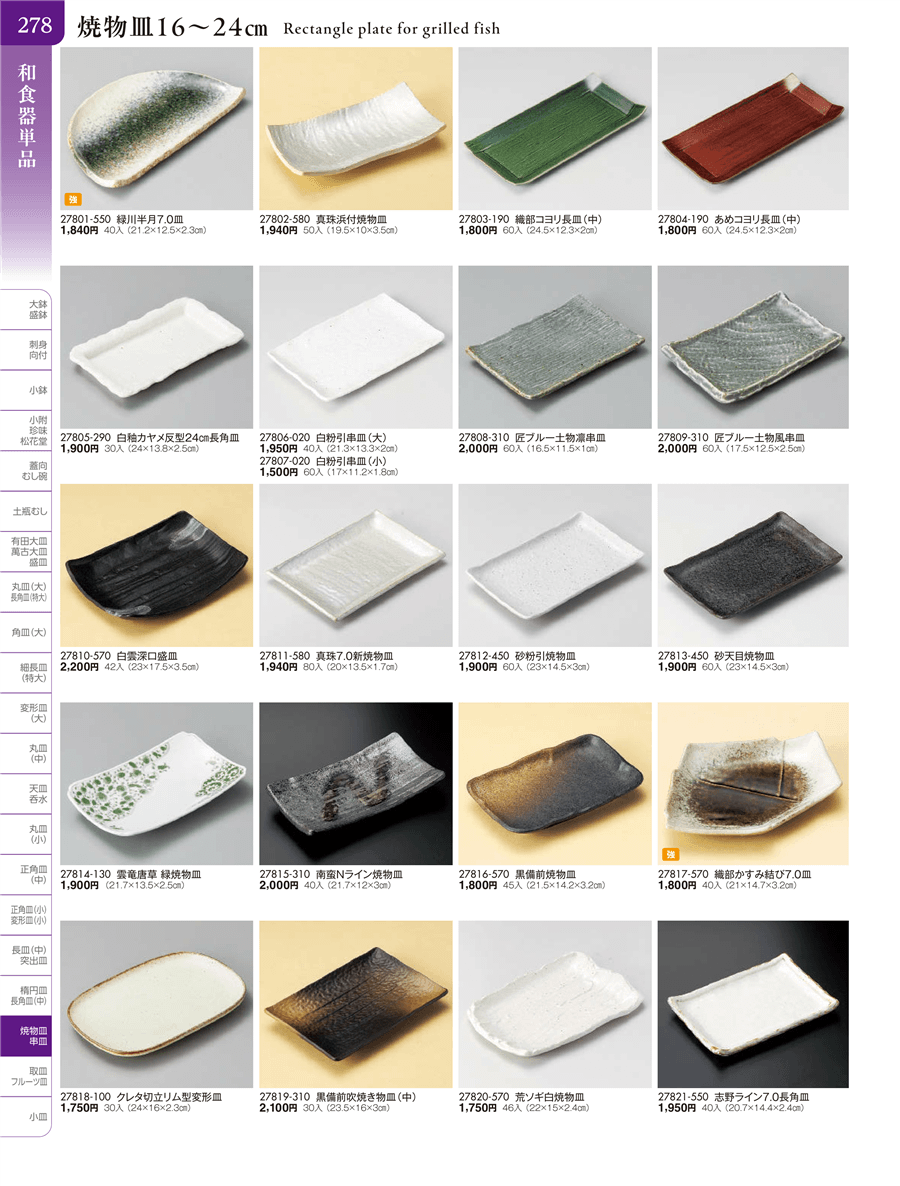 | 27821-550 | 志野ライン7.0長角皿 | 上代 1,950円(税抜) 卸値 1,073円(税抜) (45%OFF) | ||