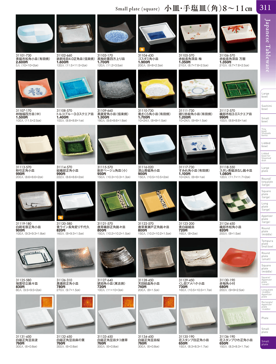 | 31119-180 | 白刷毛笹正角小皿 | 上代 900円(税抜) 卸値 496円(税抜) (45%OFF) | ||