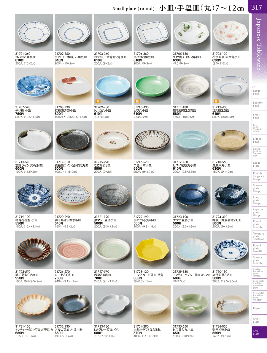 | 31709-430 | トルコ丸小皿 | 上代 610円(税抜) 卸値 336円(税抜) (45%OFF) | ||