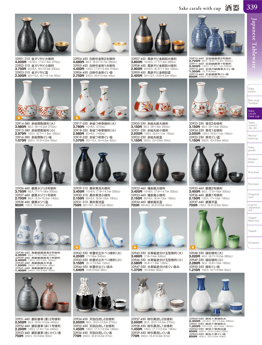 | 33945-550 | 水青磁塗分け玉型徳利(大) | 上代 3,480円(税抜) 卸値 1,915円(税抜) (45%OFF) | ||
