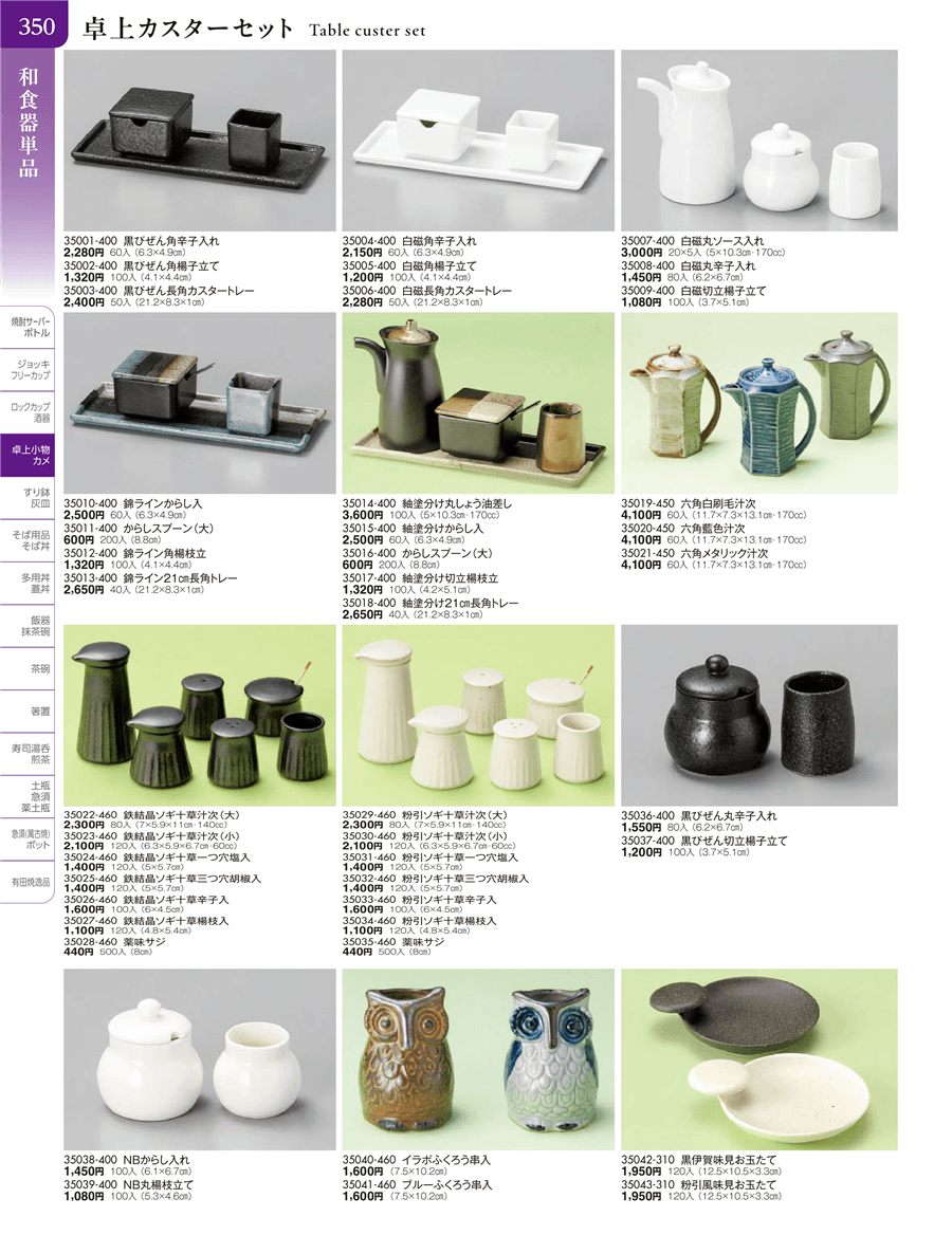 | 35001-400 | 黒びぜん角辛子入れ | 上代 2,280円(税抜) 卸値 1,254円(税抜) (45%OFF) | ||