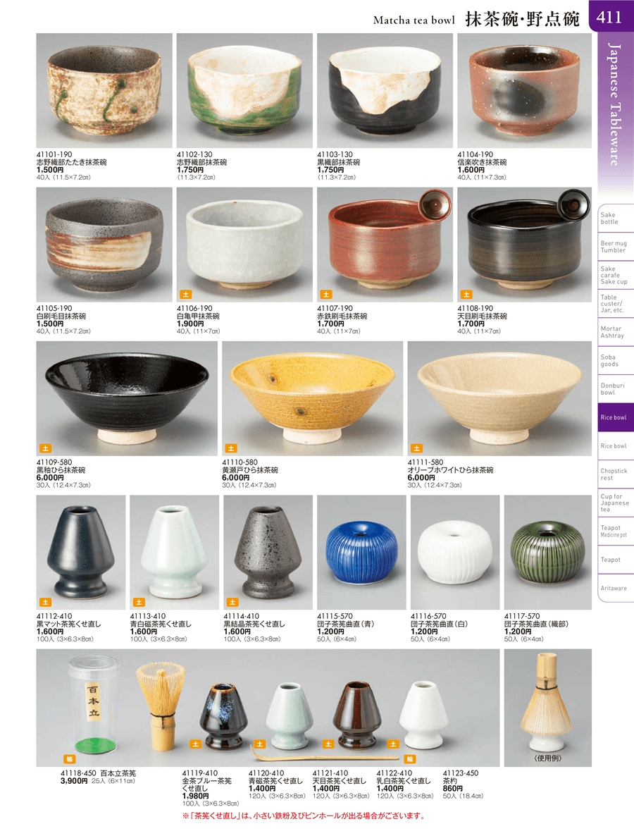 | 41105-190 | 白刷毛目抹茶碗 | 上代 1,500円(税抜) 卸値 826円(税抜) (45%OFF) | ||