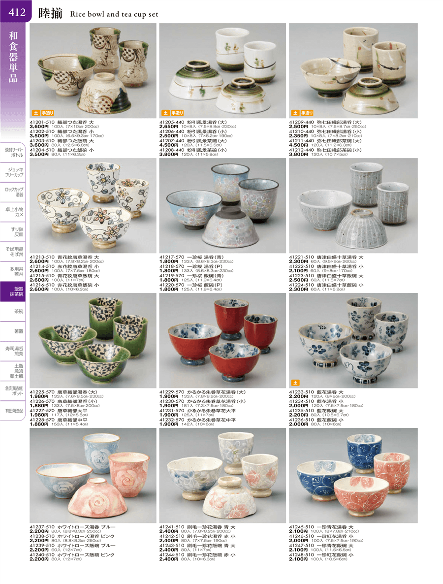 | 41223-510 | 唐津白盛十草飯碗 大 | 上代 2,500円(税抜) 卸値 1,375円(税抜) (45%OFF) | ||