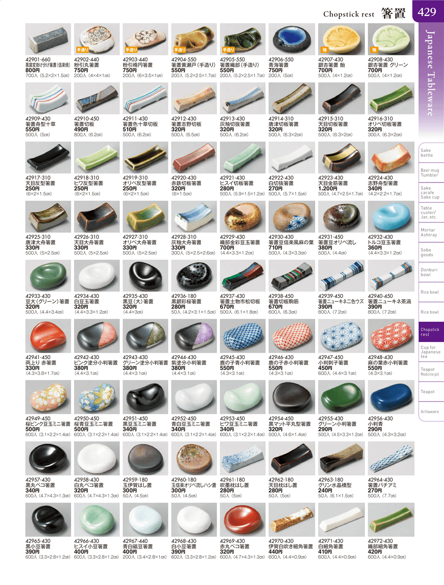 | 42914-310 | 唐津切板箸置 | 上代 320円(税抜) 卸値 176円(税抜) (45%OFF) | ||