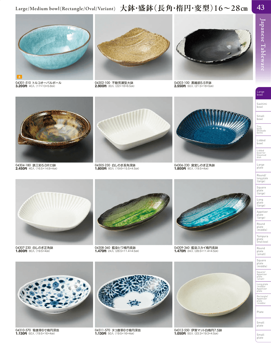 | 04305-230 | 白しのぎ長角深鉢 | 上代 1,800円(税抜) 卸値 991円(税抜) (45%OFF) | ||