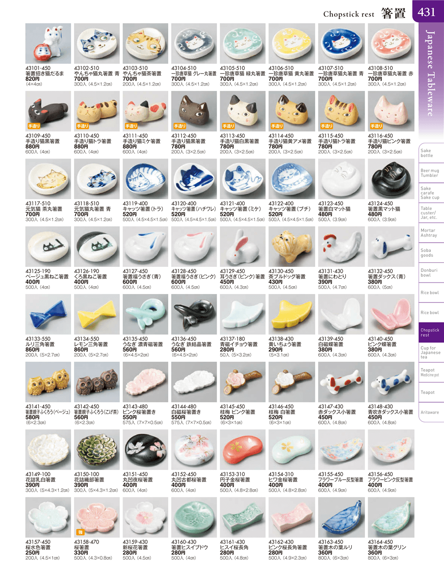 | 43110-450 | 手造り猫トラ箸置 | 上代 880円(税抜) 卸値 485円(税抜) (45%OFF) | ||