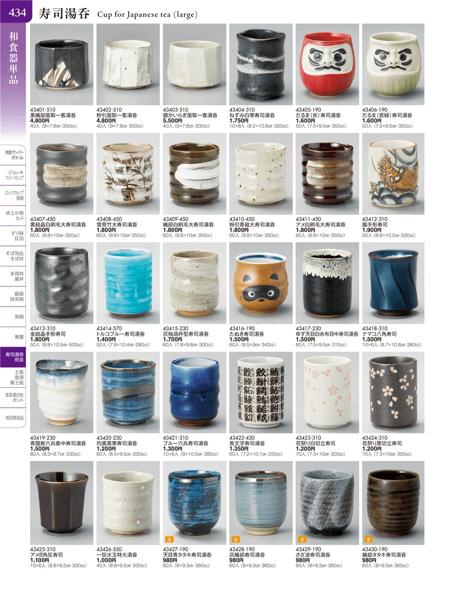 | 43406-190 | だるま(若緑)寿司湯呑 | 上代 1,600円(税抜) 卸値 881円(税抜) (45%OFF) | ||