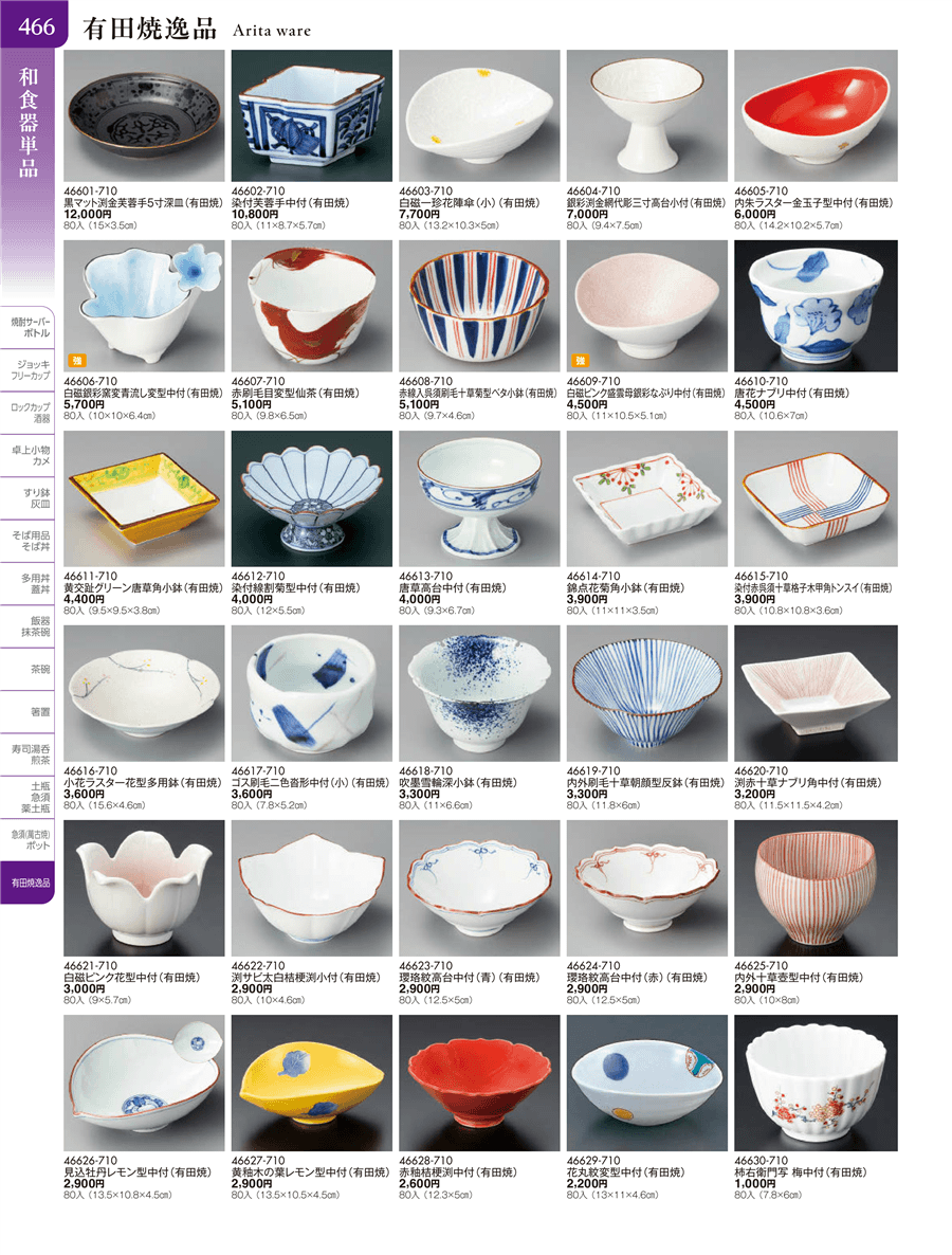 | 46610-710 | 唐花ナブリ中付(有田焼) | 上代 4,500円(税抜) 卸値 2,475円(税抜) (45%OFF) | ||
