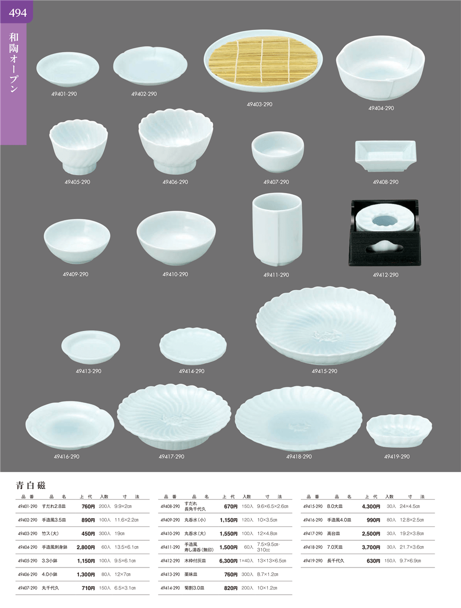 | 49408-290 | 青白磁 すだれ長角千代久 | 上代 670円(税抜) 卸値 369円(税抜) (45%OFF) | ||