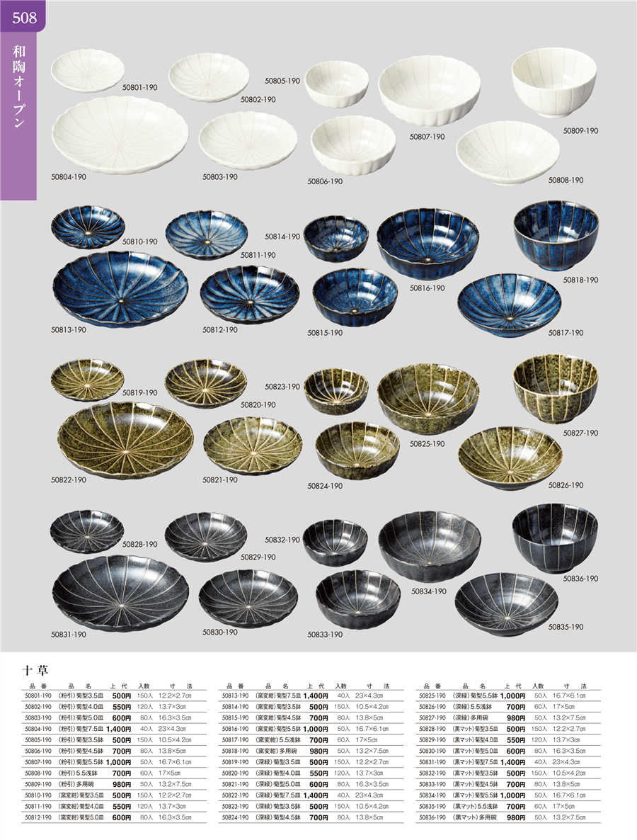 | 50829-190 | 十草 (黒マット)菊型4.0皿 | 上代 550円(税抜) 卸値 303円(税抜) (45%OFF) | ||