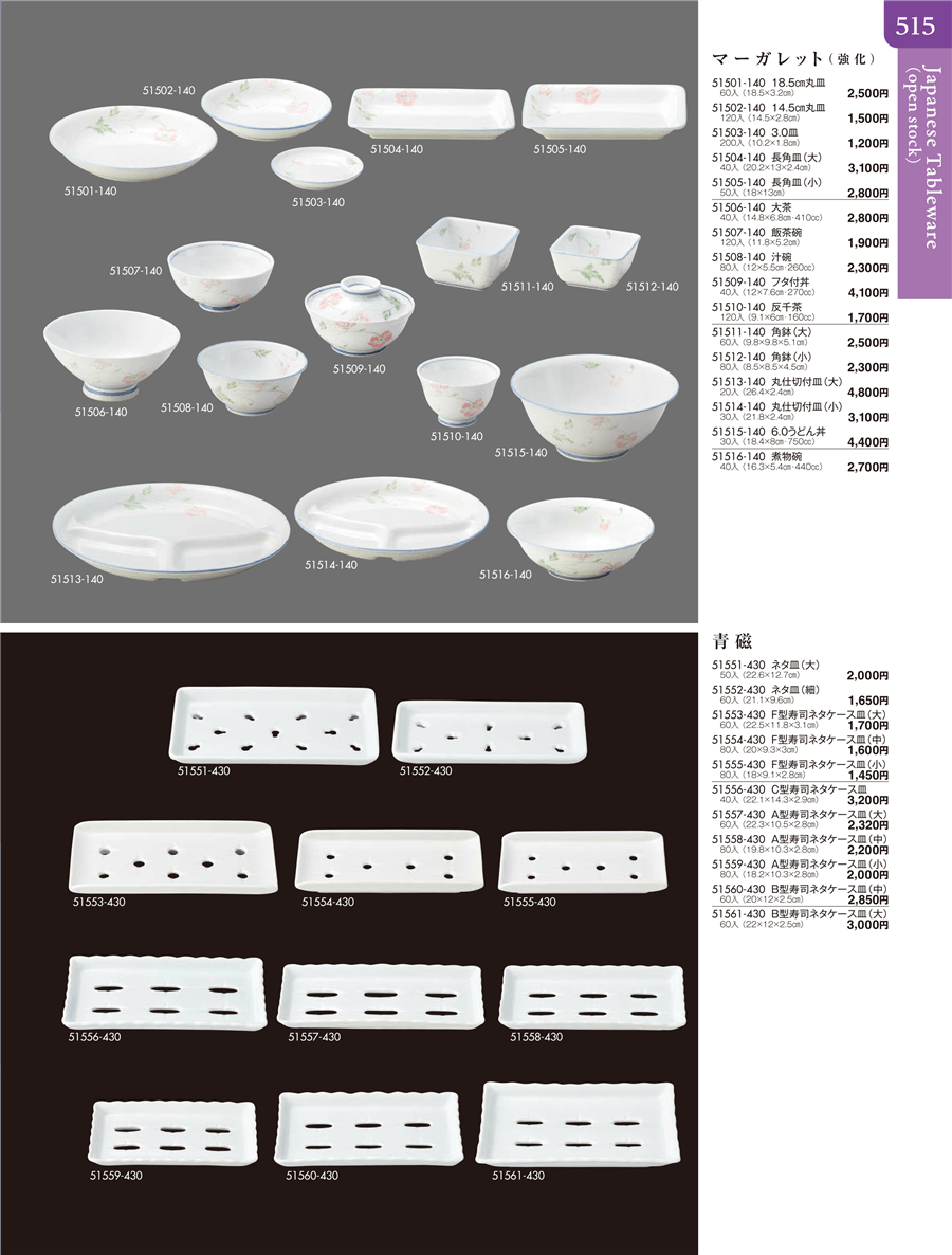 | 51504-140 | マーガレット 長角皿(大) | 上代 3,100円(税抜) 卸値 1,706円(税抜) (45%OFF) | ||