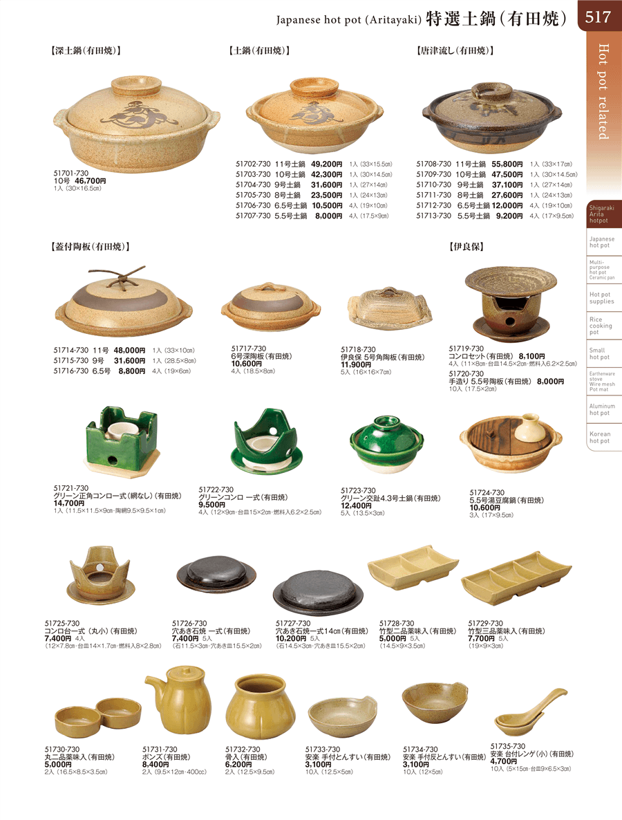 | 51713-730 | 唐津流し 5.5号土鍋(有田焼) | 上代 9,200円(税抜) 卸値 5,060円(税抜) (45%OFF) | ||