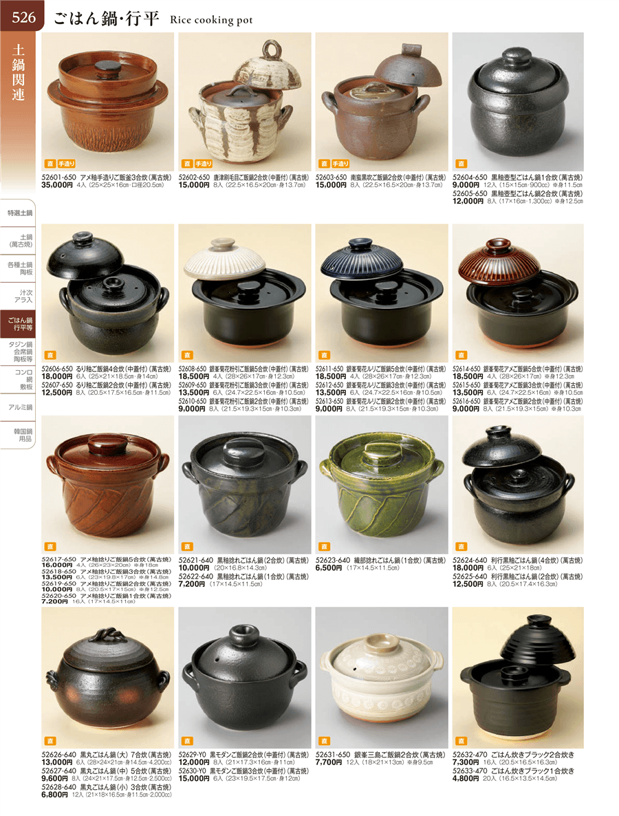 | 52601-650 | アメ釉手造りご飯釜3合炊(萬古焼) | 上代 35,000円(税抜) 卸値 19,250円(税抜) (45%OFF) | ||
