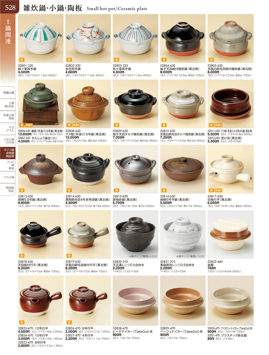 | 52805-650 | 京風白刷毛目碗付雑炊鍋(萬古焼) | 上代 8,000円(税抜) 卸値 4,400円(税抜) (45%OFF) | ||