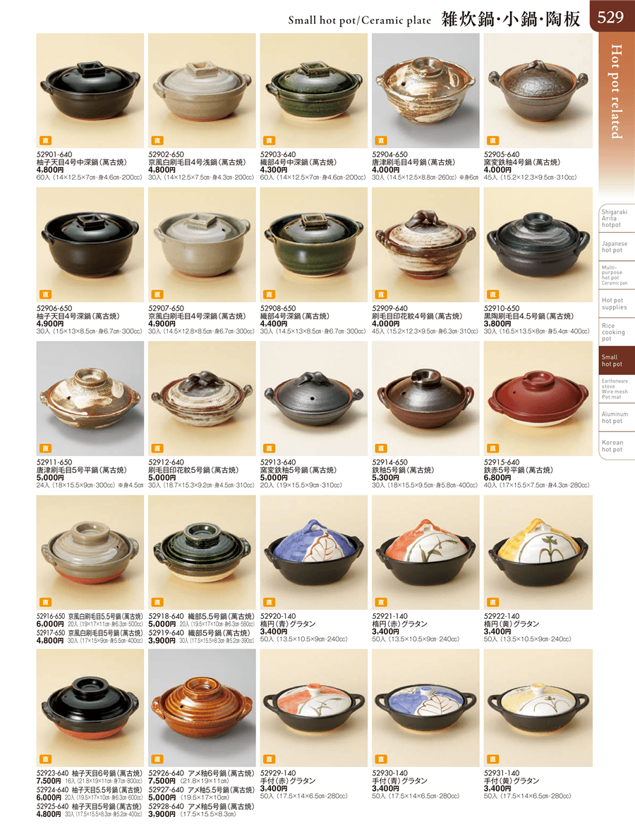 | 52905-640 | 窯変鉄釉4号鍋(萬古焼) | 上代 4,000円(税抜) 卸値 2,200円(税抜) (45%OFF) | ||