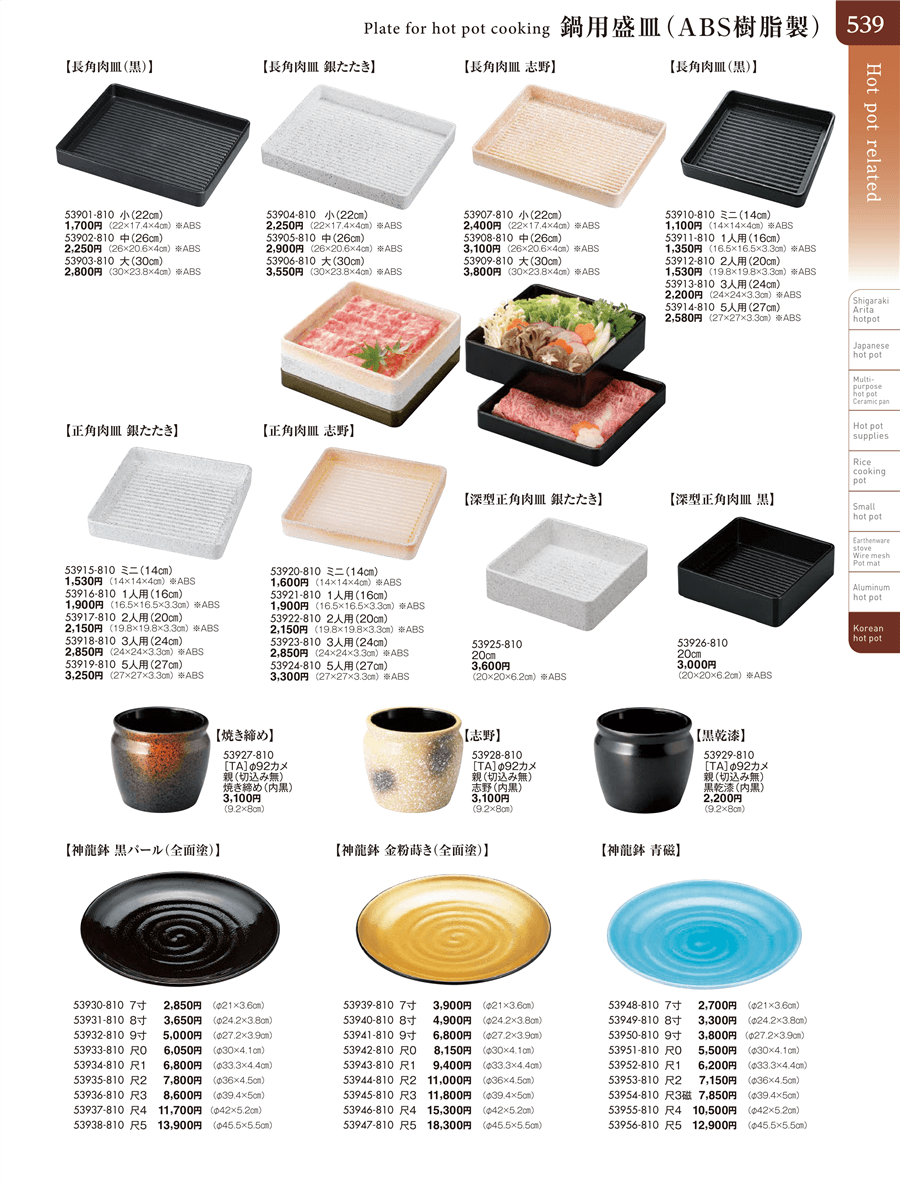 | 53913-810 | 正角肉皿(黒) 3人用(24㎝) | 上代 2,200円(税抜) 卸値 1,210円(税抜) (45%OFF) | ||