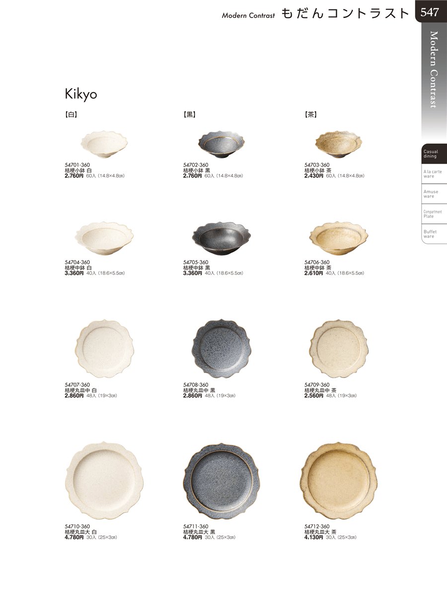| 54712-360 | 桔梗丸皿大 茶 | 上代 4,130円(税抜) 卸値 2,272円(税抜) (45%OFF) | ||
