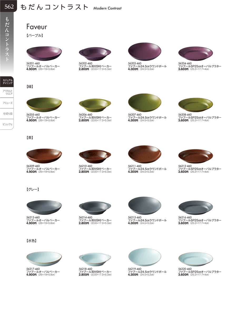| 56216-460 | ファブールSP25㎝オーバルプラター(グレー) | 上代 3,600円(税抜) 卸値 1,981円(税抜) (45%OFF) | ||