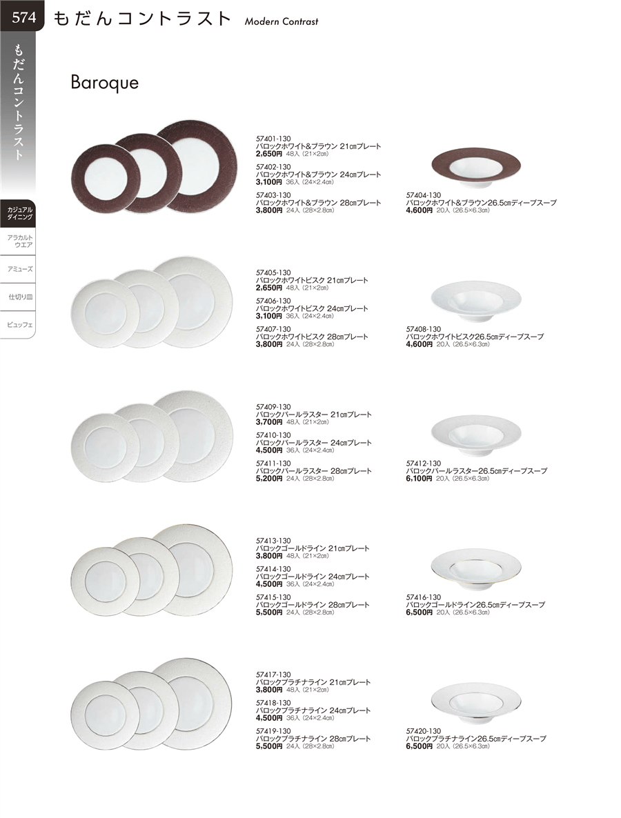 | 57416-130 | バロックゴールドライン26.5㎝ディープスープ | 上代 6,500円(税抜) 卸値 3,576円(税抜) (45%OFF) | ||