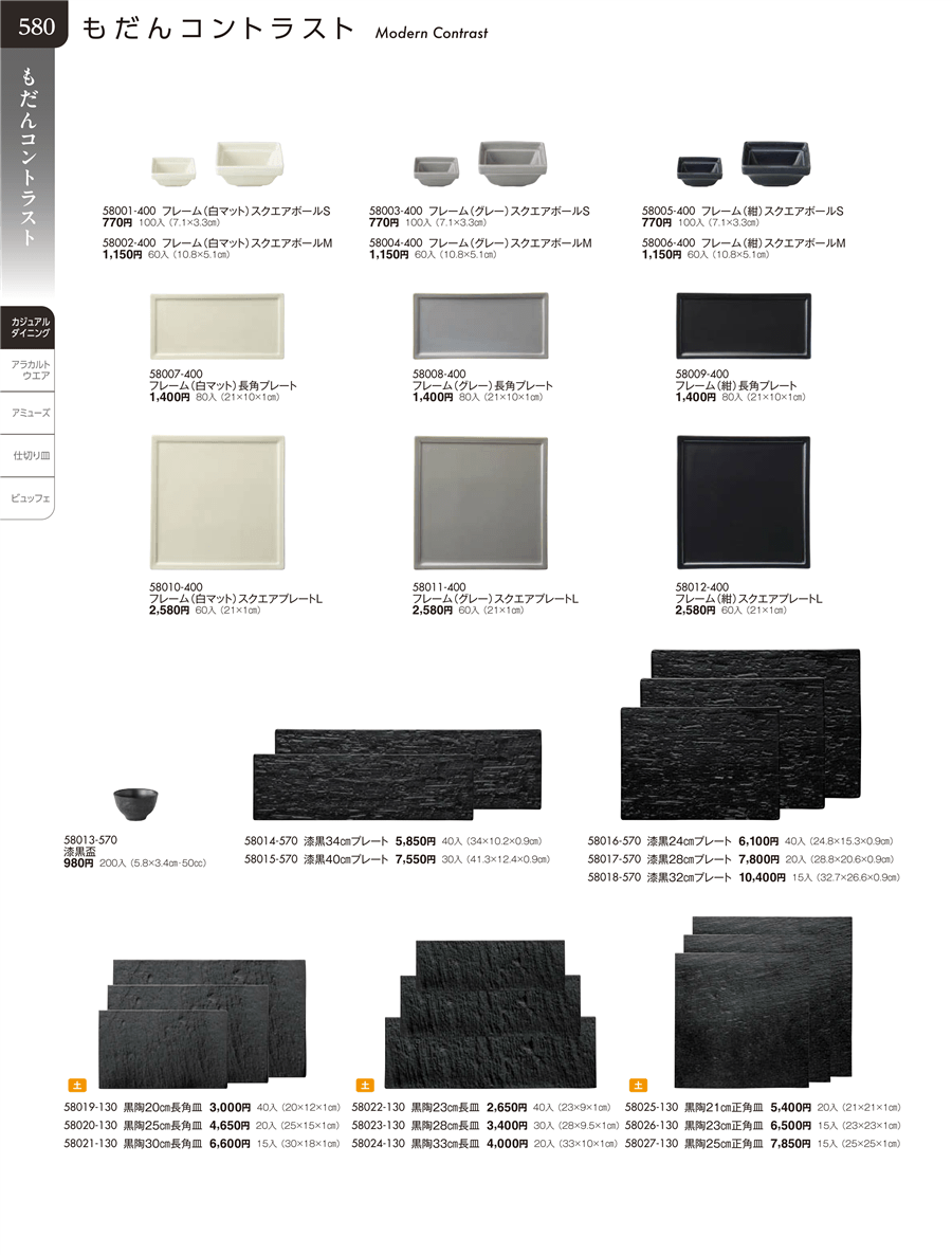 | 58025-130 | 黒陶21㎝正角皿 | 上代 5,400円(税抜) 卸値 2,971円(税抜) (45%OFF) | ||