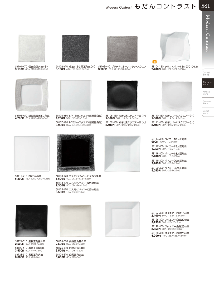 | 58130-400 | スクエアー白磁26㎝皿 | 上代 5,000円(税抜) 卸値 2,750円(税抜) (45%OFF) | ||