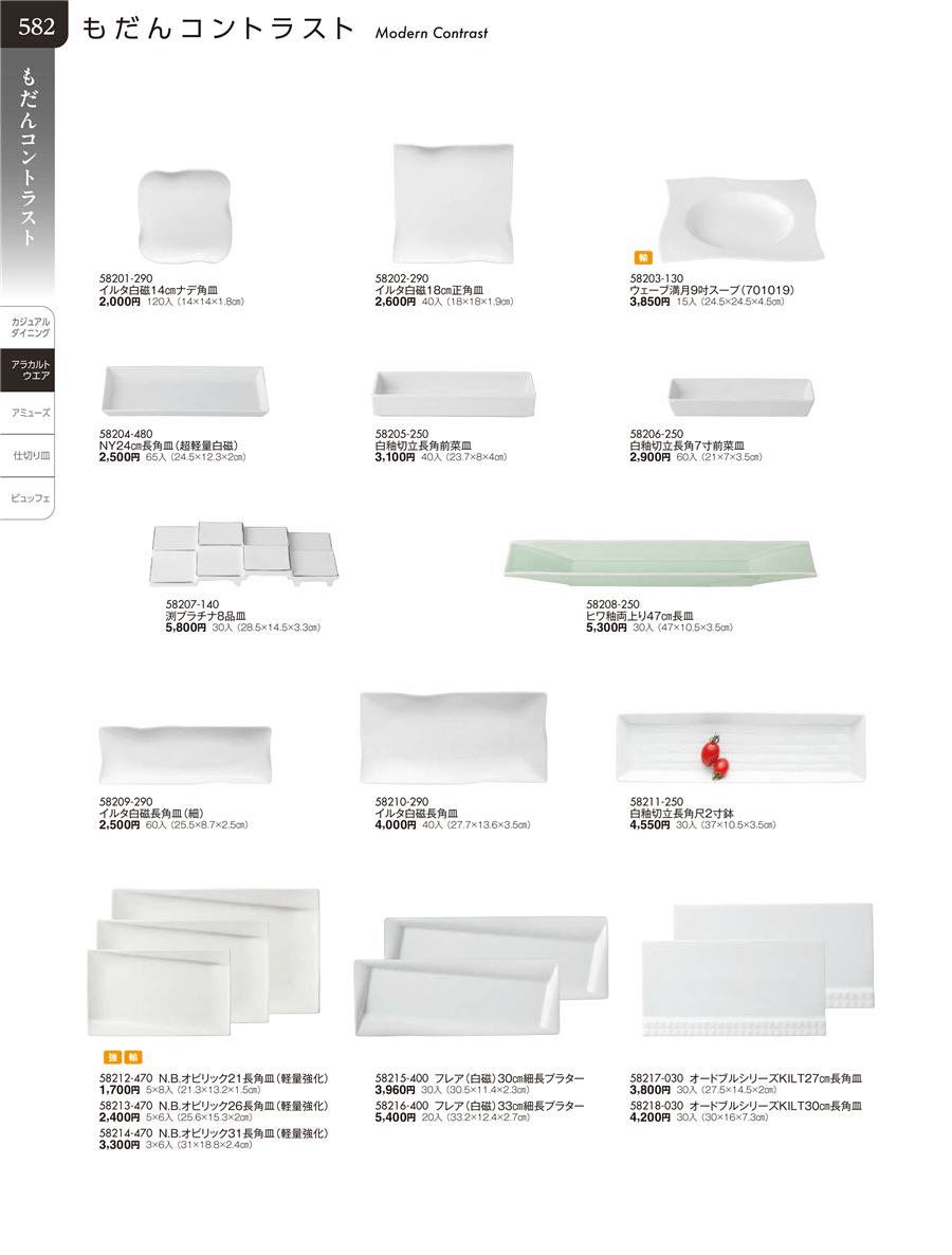 | 58205-250 | 白釉切立長角前菜皿 | 上代 3,100円(税抜) 卸値 1,706円(税抜) (45%OFF) | ||