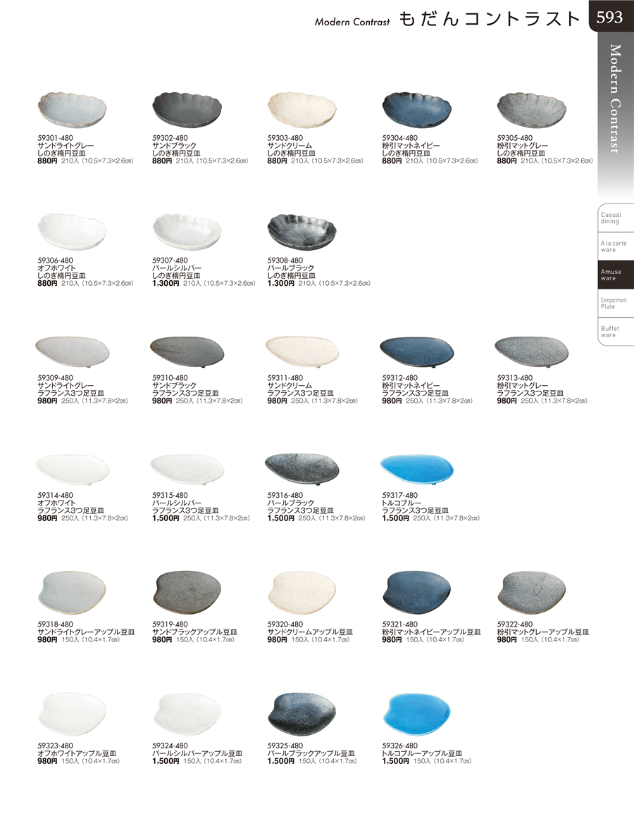 | 59301-480 | サンドライトグレーしのぎ楕円豆皿 | 上代 880円(税抜) 卸値 485円(税抜) (45%OFF) | ||