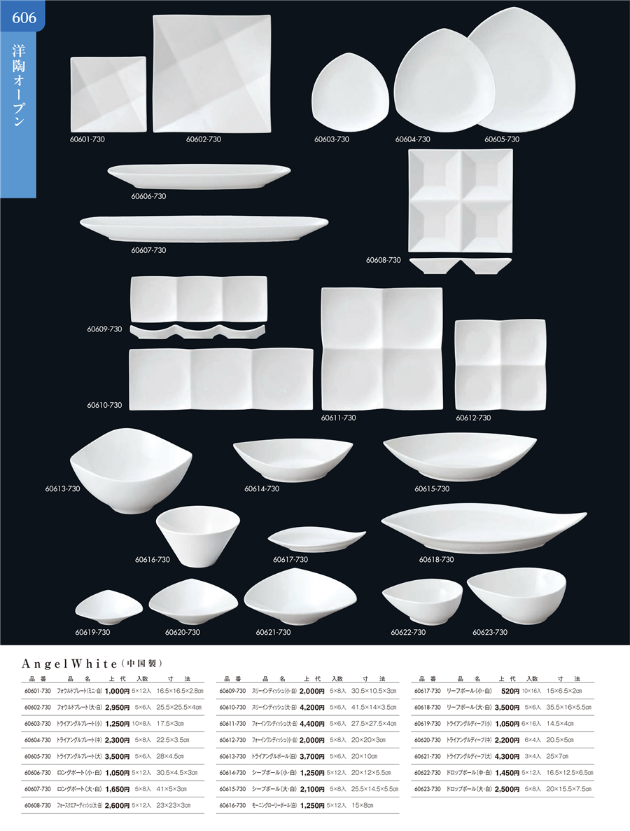 | 60610-730 | AngelWhite スリーインディッシュ(大・白) | 上代 4,200円(税抜) 卸値 2,310円(税抜) (45%OFF) | ||