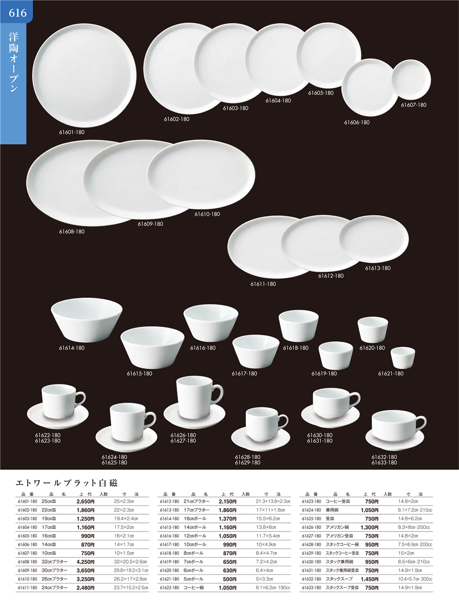 | 61612-180 | エトワールプラット白磁 21㎝プラター | 上代 2,150円(税抜) 卸値 1,183円(税抜) (45%OFF) | ||