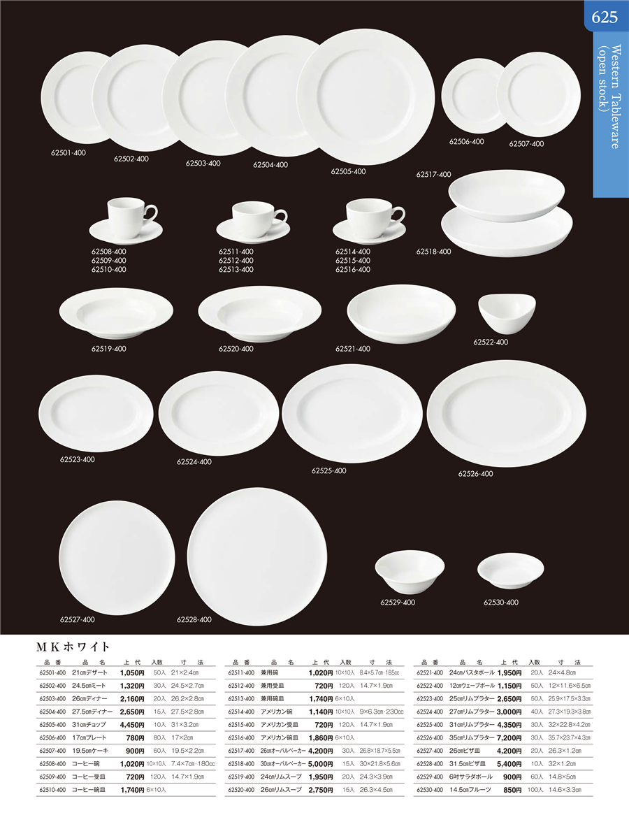 | 62504-400 | MKホワイト 27.5㎝ディナー | 上代 2,650円(税抜) 卸値 1,458円(税抜) (45%OFF) | ||