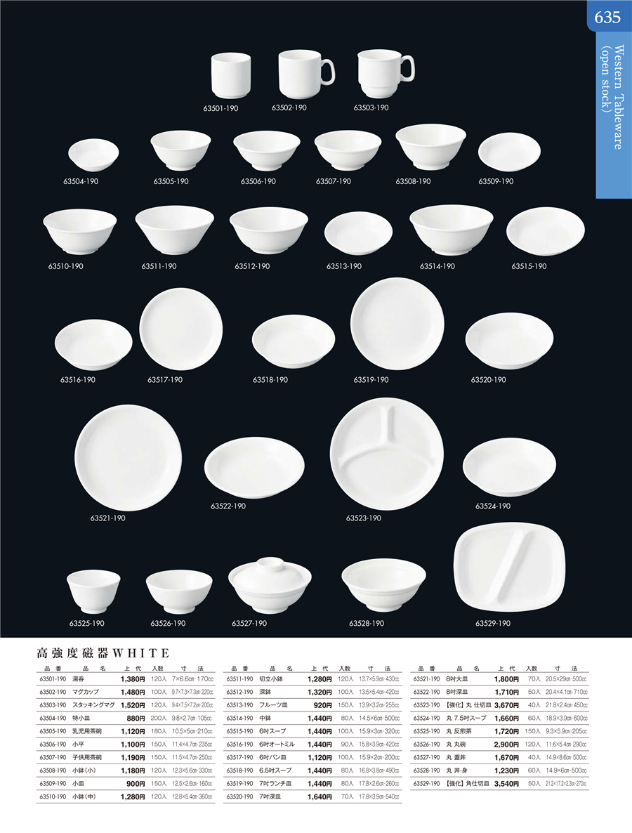 | 63506-190 | 高強度磁器WHITE 小平 | 上代 1,100円(税抜) 卸値 605円(税抜) (45%OFF) | ||
