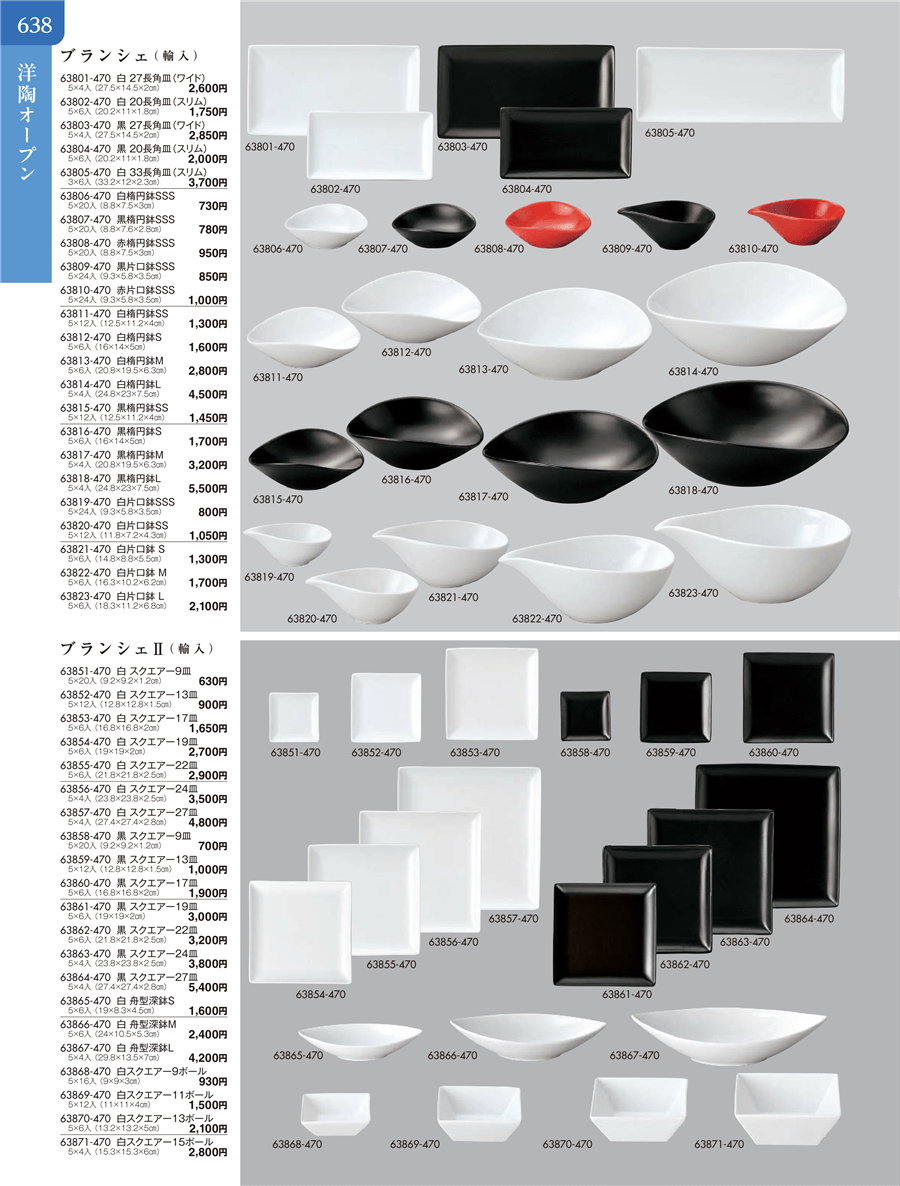 | 63863-470 | ブランシェⅡ 黒 スクエアー24皿 | 上代 3,800円(税抜) 卸値 2,090円(税抜) (45%OFF) | ||