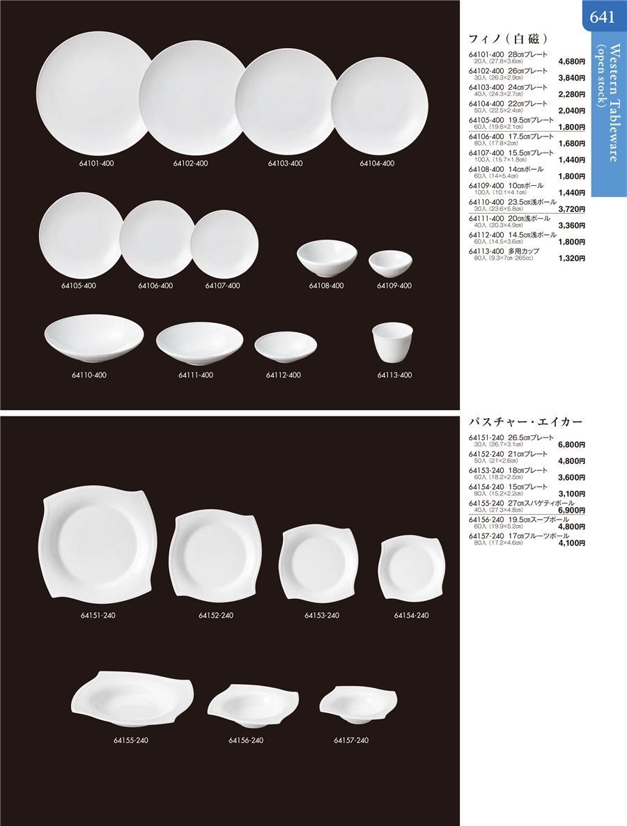 | 64101-400 | フィノ(白磁) 28㎝プレート | 上代 4,680円(税抜) 卸値 2,574円(税抜) (45%OFF) | ||