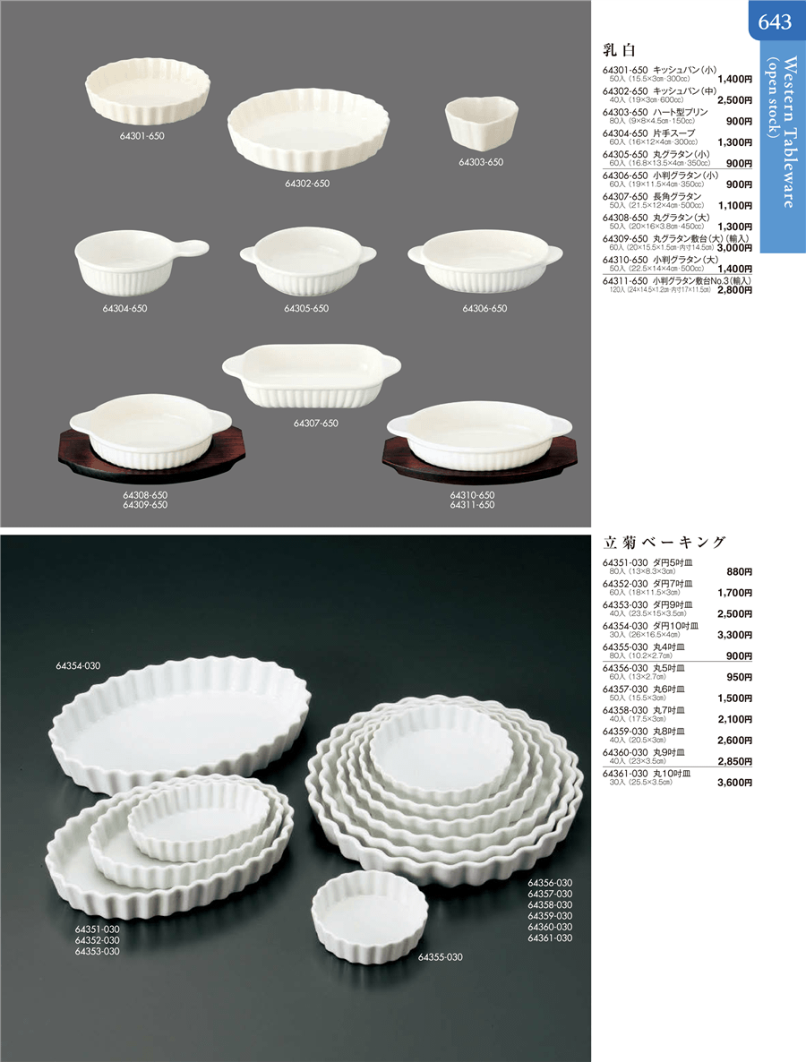 | 64308-650 | 乳白 丸グラタン(大) | 上代 1,300円(税抜) 卸値 716円(税抜) (45%OFF) | ||