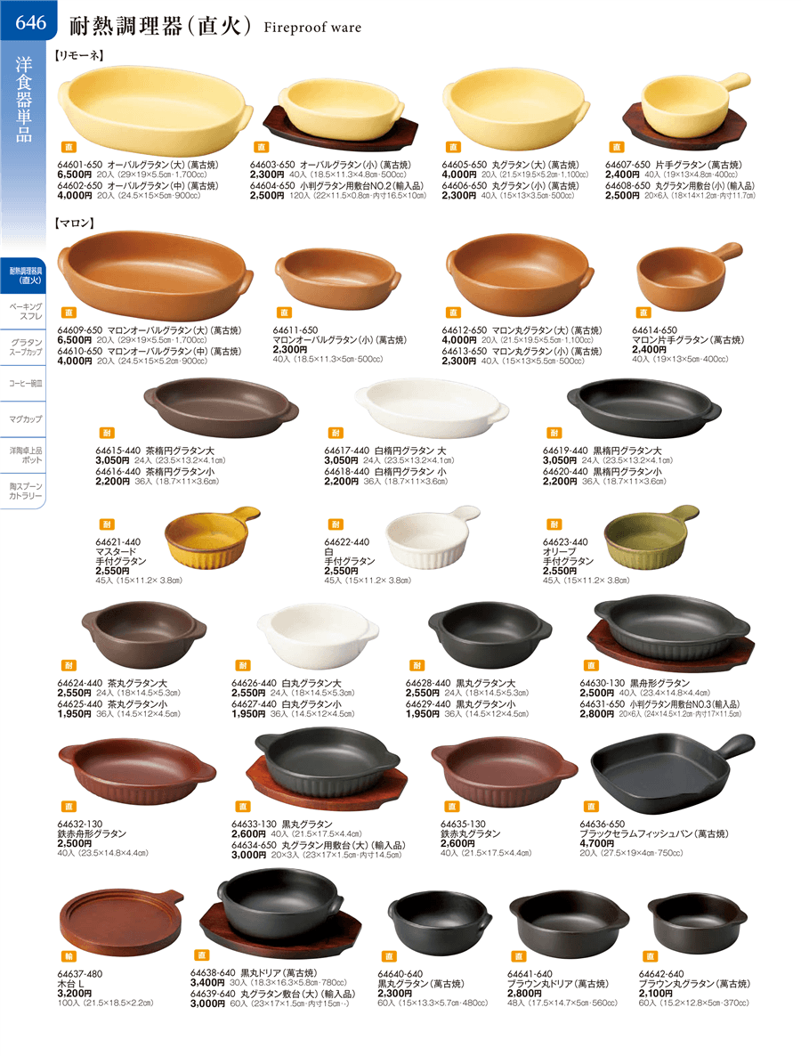 | 64640-640 | 黒丸グラタン(萬古焼) | 上代 2,300円(税抜) 卸値 1,265円(税抜) (45%OFF) | ||