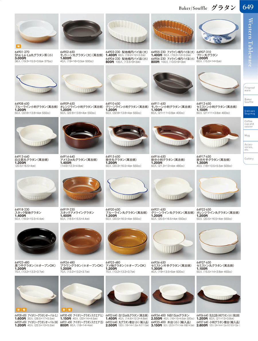| 64913-640 | 白立筋丸グラタン(萬古焼) | 上代 1,200円(税抜) 卸値 660円(税抜) (45%OFF) | ||