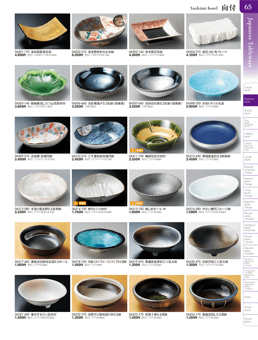 | 06511-100 | 織部切合せ向付 | 上代 2,550円(税抜) 卸値 1,403円(税抜) (45%OFF) | ||