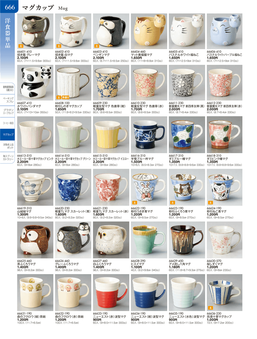 | 66625-460 | 茶ふくろうマグ | 上代 1,400円(税抜) 卸値 771円(税抜) (45%OFF) | ||