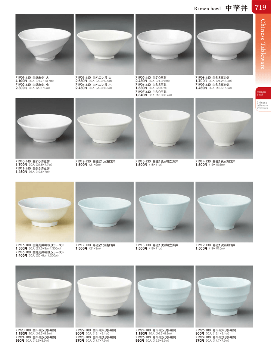 | 71916-100 | 白無地中華6.5ラーメン | 上代 1,400円(税抜) 卸値 771円(税抜) (45%OFF) | ||