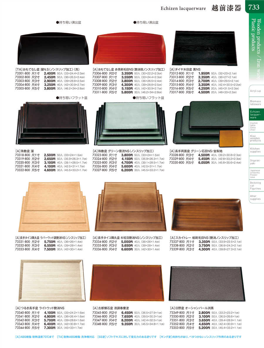 | 73333-800 | [A]長手タイコ隅丸盆 ラバーウッド調艶消NS(ノンスリップ加工)尺4寸 | 上代 7,500円(税抜) 卸値 4,125円(税抜) (45%OFF) | ||