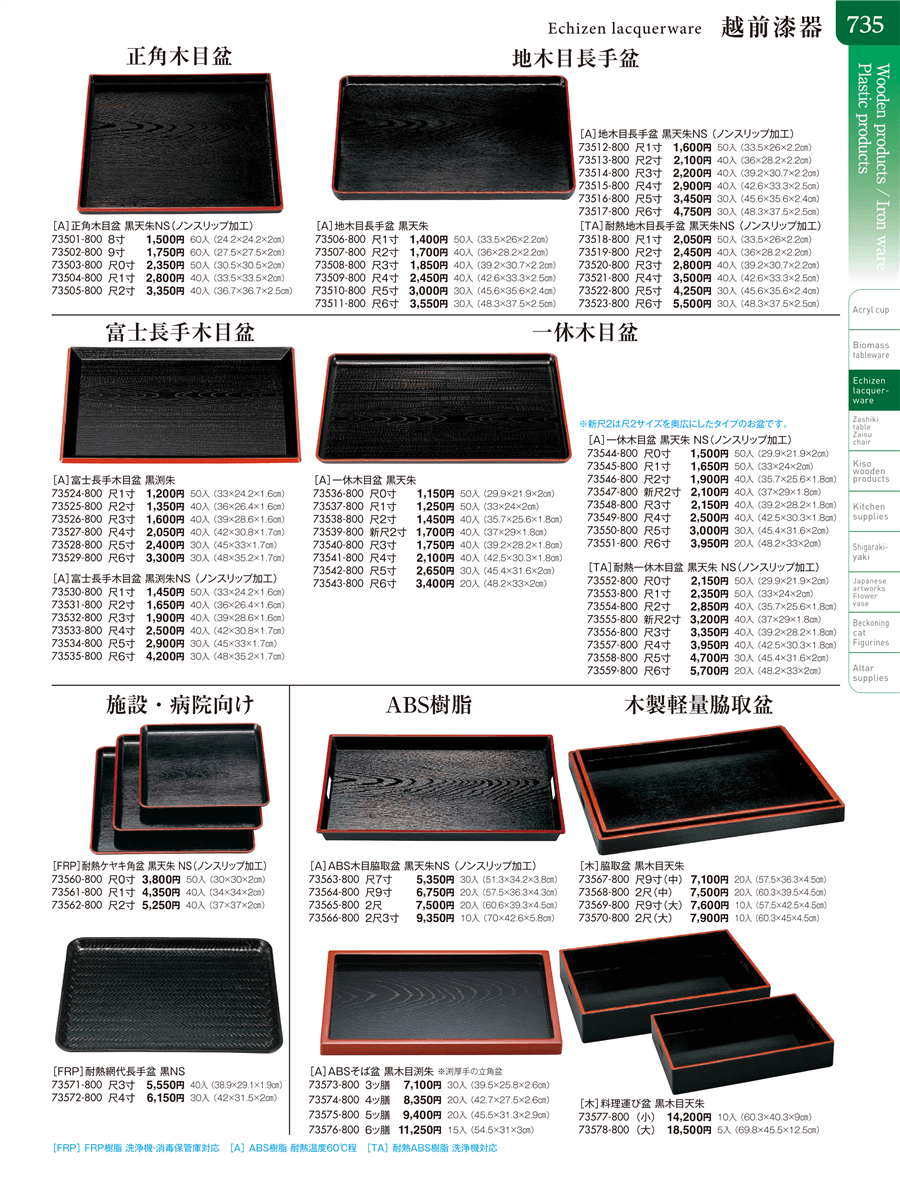 | 73560-800 | [FRP]耐熱ケヤキ角盆 黒天朱 NS(ノンスリップ加工)尺0寸 | 上代 3,800円(税抜) 卸値 2,090円(税抜) (45%OFF) | ||