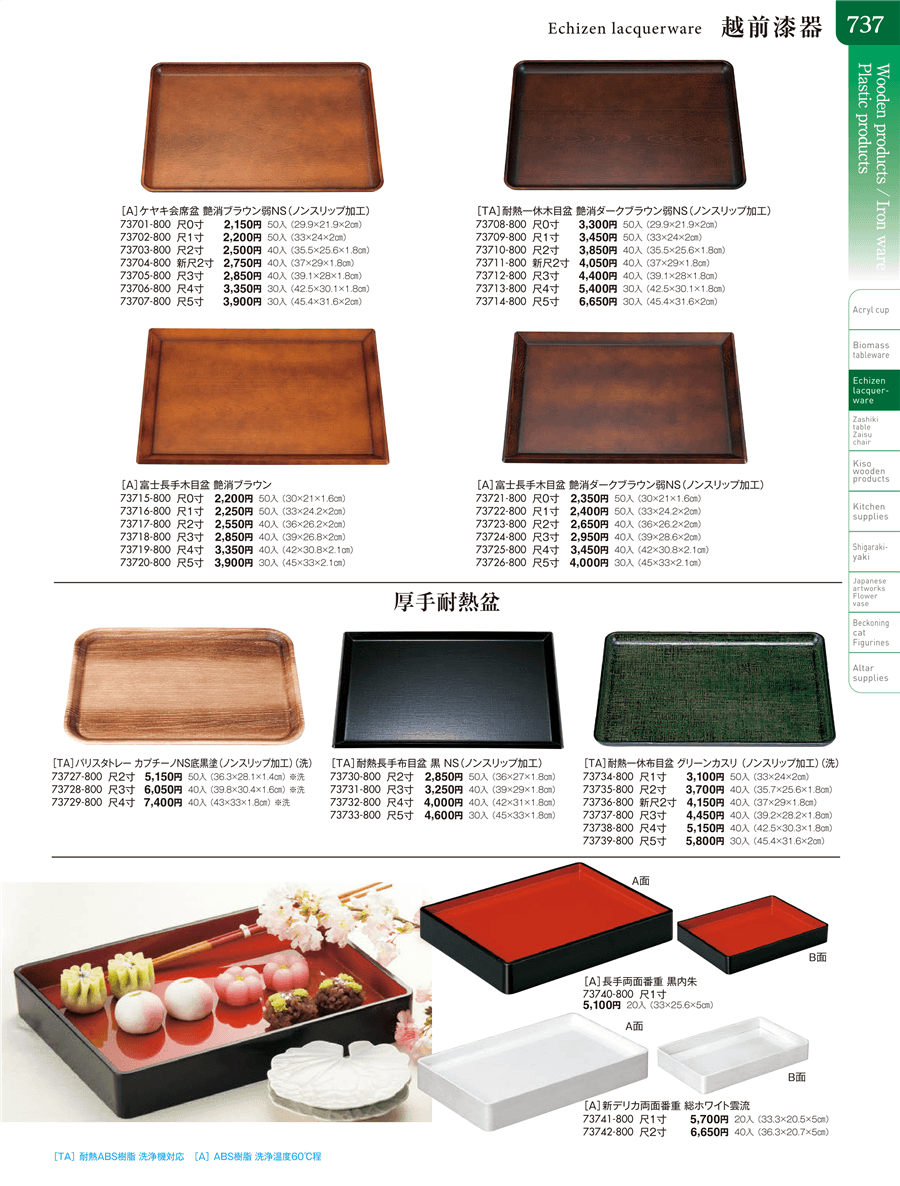 | 73701-800 | [A]ケヤキ会席盆 艶消ブラウン弱NS(ノンスリップ加工)尺0寸 | 上代 2,150円(税抜) 卸値 1,183円(税抜) (45%OFF) | ||